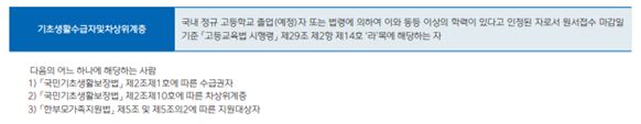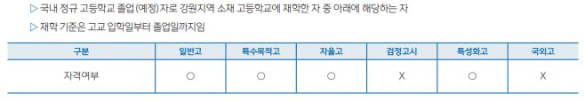 일반적으로 지역인재전형은 일반 지역인재전형과 다양한 명칭의 기초생활수급자 및 차상위계층 지역인재전형이 있는데요, 지원자격을 살펴보면 아래와 같습니다.