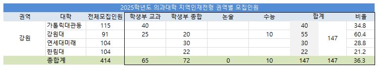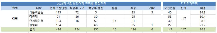 2025학년도 대입전형 시행계획에 따르면 강원지역 의대 4곳 전체모집인원은 414명으로, 전형요소별로는 학생부종합 155명(37.4% ), 학생부교과 124명(30.0%), 수능 114명(27.5%), 논술 15명(3.6%) 순으로 모집합니다.