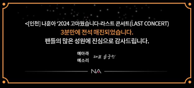 나훈아의 ‘2024 고마웠습니다-라스트 콘서트’는 4월 27일 인천 송도켄벤시아 공연을 시작으로 청주, 울산, 창원, 천안, 원주, 전주에서 펼쳐집니다. 하반기 공연은 추후 공개 예정입니다.