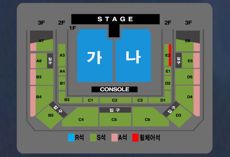 - 휠체어석은 E2구역 빨간 구역입니다.