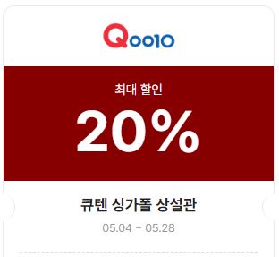 | 큐텐(싱가폴) | 20% | 05.04 ~ 05.28 | 큐텐 싱가폴 상설관 | 쿠폰 |