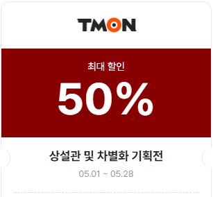 | 티몬 | 50% | 05.01 ~ 05.28 | 상설관 및 차별화 기획전 | 30% 할인쿠폰 |