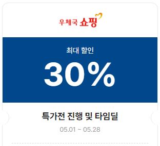 | 우체국쇼핑 | 30% | 05.01 ~ 05.28 | 특가전 진행 및 타임딜 | |