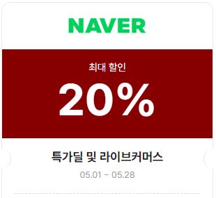 | 네이버 | 20% | 05.01 ~ 05.28 | 특가딜 및 라이브커머스 | |