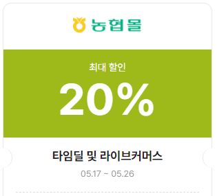 | 농협몰 | 20% | 05.01 ~ 05.28 | 타임딜 및 라이브커머스 |