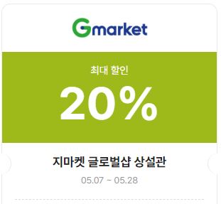 | G마켓 | 20% | 05.07 ~ 05.28 | 글로벌샾 상설관 | |