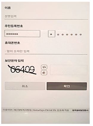 - 전 문자(SMS)로 인증하기로 진행 후 본인 이름, 주민등록번호, 보안문자 입력 후 확인 누릅니다.