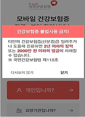 - '타인의 신분증을 도용해 진료할 경우 2년 이하의 징역 또는 2천만 원 이하의 벌금에 처해질 수 있다'라는 건강보험증 불법사용금지 팝업이 뜹니다. 내용 확인하고 닫기 버튼을 누릅니다.