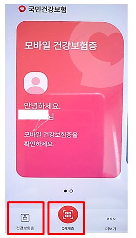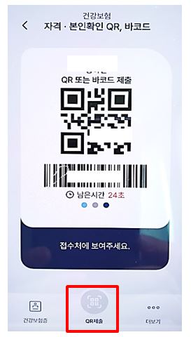 모바일 건강보험증 하단의 QR제출을 누르시면 본인 확인을 위한 QR코드가 보이는데, 병원 진료나 약국 이용 시 보여주시면 본인확인이 완료됩니다.