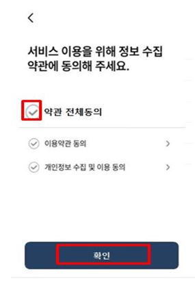- 서비스 이용을 위해 정보 수집 약관 동의는 약관 전체동의 체크 후 확인을 누릅니다.