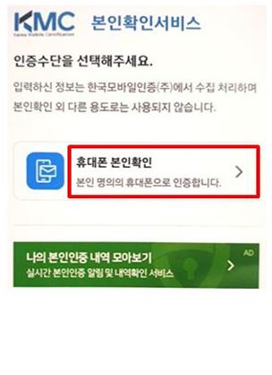 - 전 휴대폰 인증올 선택 후 휴대폰 본인확인으로 진행했습니다.