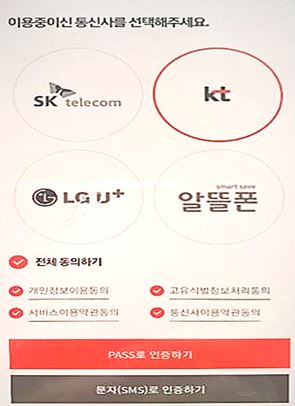 - 본인이 사용하는 통신사를 선택 후 전체 동의하기 체크합니다.