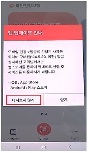 - 앱 업데이트 안내는 '다시 보지 않기' 선택합니다.
