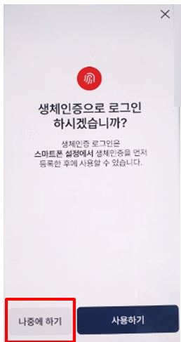 - 생체인증으로 로그인은 필요하지 않아서 '나중에 하기' 선택