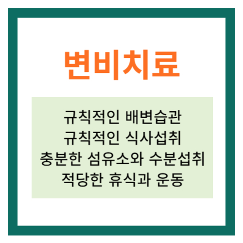 변비의 치료를 위해서는 규칙적인 배변습관과 규칙적인 식사섭취, 충분한 섬유소와 수분섭취, 적당한 휴식과 운동 등과 같이 전반적인 생활습관의 변화가 필요합니다.