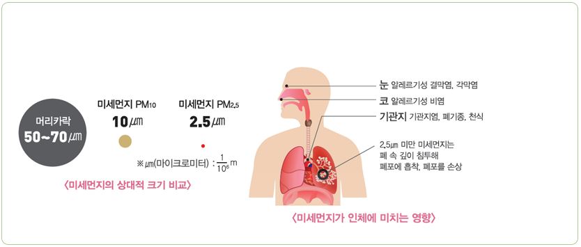 미세먼지의 상대적 크기와 인체에 미치는 영향
