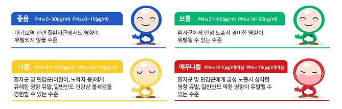 환경부에서는 대기오염으로 인한 국민 건강 피해를 최소화하기 위해 미세먼지 농도별 예보등급을 좋음, 보통, 나쁨, 매우 나쁨의 네 단계로 구분하여 하루 4번(오전 5시, 오전 11시, 오후 5시, 오후 11시) 예보하고 있습니다. 내일의 대기질을 대기모델링 등을 이용하여 환경부가 예측·발표합니다.
