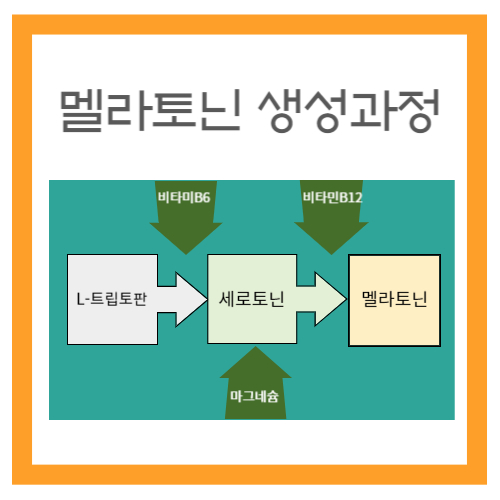 - 멜라토닌은 우리 몸에서 필수 아미노산인 트립토판에서 세로토닌을 거쳐 생성됩니다.