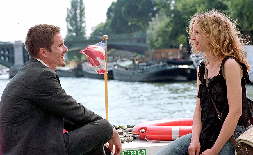 현재 작가인 제시(에탄 호크)는 9년 전 비엔나에서 셀린(줄리 델피)과의 우연한 만남을 바탕으로 한 소설을 홍보하기 위해 파리를 방문합니다. 파리 서점에서 열린 도서 행사에서 제시는 청중들 속에 있는 셀린을 보고 놀랍니다. 이 예상치 못한 재회는 제시의 임박한 미국행 비행기 전에 두 인물이 더 많은 시간을 함께 보내는 촉매제가 됩니다. 그들이 파리의 거리를 횡단하면서 제시와 셀린 사이에 공유된 심오한 대화와 감정을 친밀하게 엿볼 수 있는 실시간으로 영화가 펼쳐집니다. 등장인물들은 그들의 삶, 꿈, 후회, 그리고 그들의 초기 만남의 영향에 대해 논의합니다. 대화는 사랑, 시간, 그리고 인간관계의 복잡성에 대한 철학적 성찰로 풍부합니다. 파리 자체는 영화에서 중요한 역할을 하며 펼쳐지는 이야기에 그림 같은 배경 역할을 합니다. 영화 촬영은 몽마르트르와 센 강둑과 같은 상징적인 장소를 보여주면서 도시의 낭만적인 분위기를 포착합니다. 파리의 시각적 매력은 등장인물들의 대화의 감정적인 깊이를 보완하여 관객에게 감각적인 경험을 만들어냅니다. 영화는 사랑, 선택, 그리고 시간의 흐름에 대한 주제를 탐구합니다. 제시와 셀린느는 시간이 지남에 따라 그들의 의견의 결과에 대해 씨름하고 이야기는 운세, 인맥, 그리고 사랑의 영원한 본질에 대한 질문을 제기합니다. 실시간 형식은 그들의 거래의 근접성을 높이고 팔로워십이 압축된 시간 내에 그들의 관계를 정교화하는 것을 목격할 수 있도록 합니다. 이단 호크와 줄리 델피는 그들의 캐릭터에 진정성과 깊이를 가져다주면서 설득력 있는 연기를 보여줍니다.