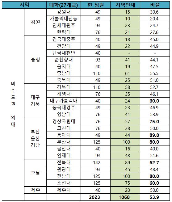 비수도권 의대 중 대구가톨릭대(60%), 경상국립대(75%), 동아대(89.8%), 부산대(80%), 전북대(62.7%)는 2024학년도 대입에서 정원의 60% 이상을 지역인재전형으로 모집하고 있습니다.