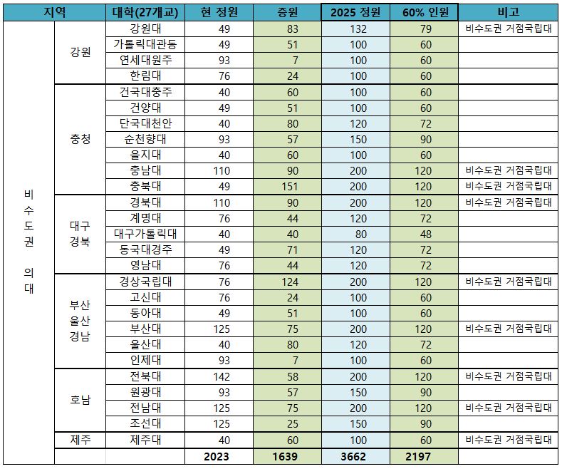 2025학년도 의대증원 배분계획에 따르면 현 의대 정원은 2,023명에서 3,662명으로 1,639명이 늘어나게 됩니다. 특히 지역인재전형을 정원의 60%까지 확대하면 지역인재전형 인원은 최소 2,197명 이상 늘어나게 됩니다.