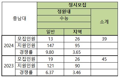 2023~2024학년도 충남대 수시모집 및 정시모집 모집인원, 지원인원 및 경쟁률입니다.