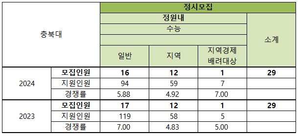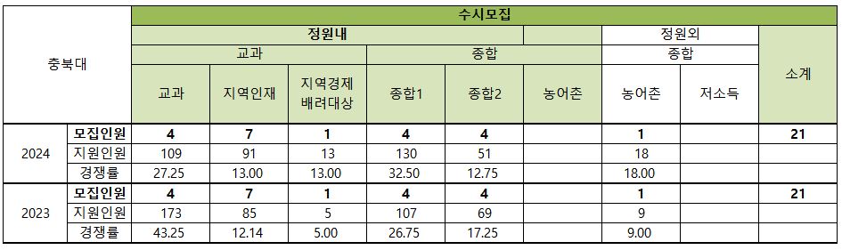 2025학년도 대학입학전형 기본계획에 따르면 현재 기준 충북대 모집 인원은 수시 24명, 정시 26명 총 49명입니다.