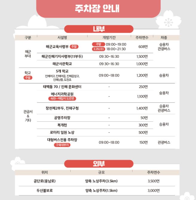 진해군항제 기간 동안 운영되는 내부·외부 주차장을 꼭 확인하시기 바랍니다.